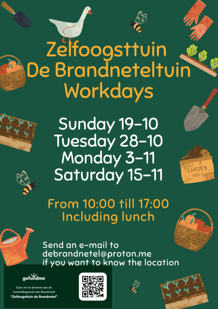 Er is altijd veel werk op de tuin, dus je zult ook altijd bij kunnen dragen door mee te komen helpen! De tuin is op dinsdag, woensdag, donderdag en zondag geopend. Ook plannen we gezamenlijk werkdagen om het werk wat gezelliger te maken. Mocht je een keertje mee willen helpen, stuur dan voor de zekerheid een mailtje als je mee wil komen helpen (debrandnetel@proton.me).